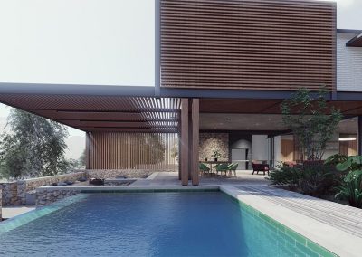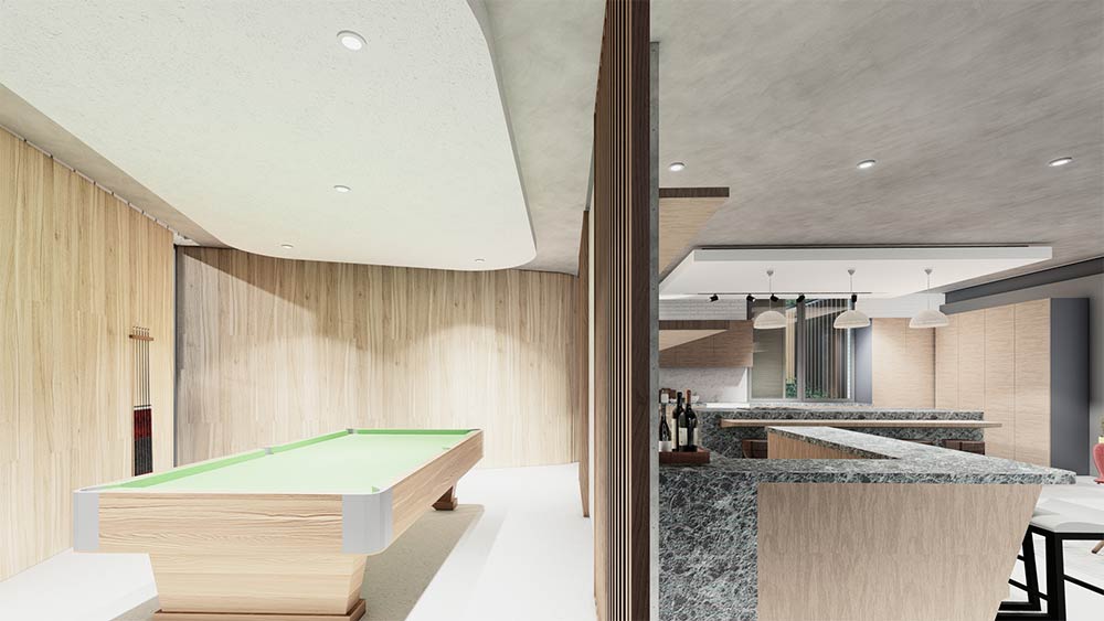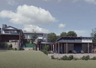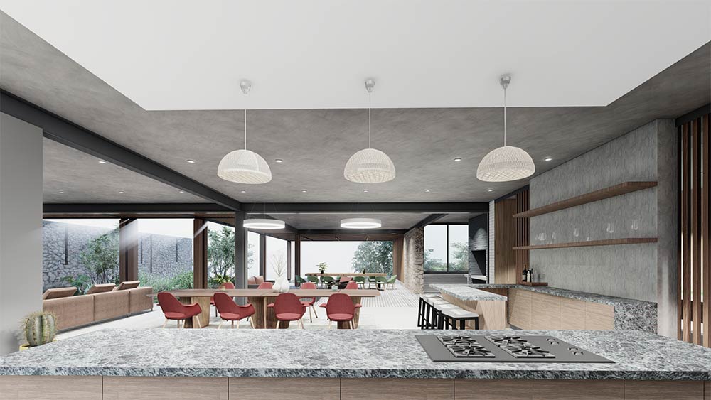 We designed an open-plan living, dining, and entertainment area that embraces the breathtaking vista of Roodeplaat Dam, connecting with the stunning outdoor surroundings. Within this space, the main kitchen, dining room, and bar coexist harmoniously, creating an ideal setting for convivial gatherings and memorable evenings of hospitality.