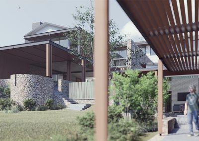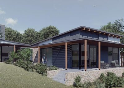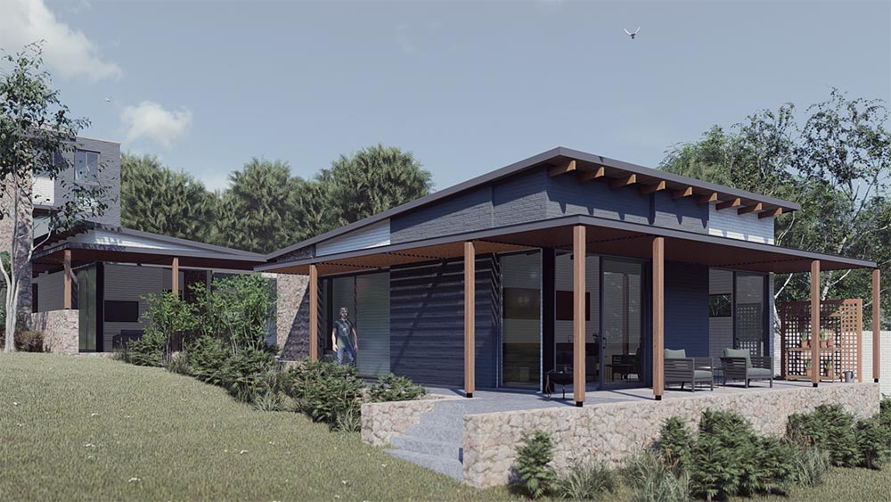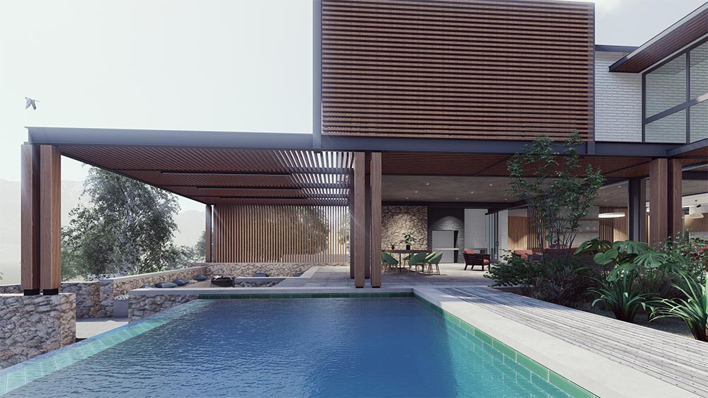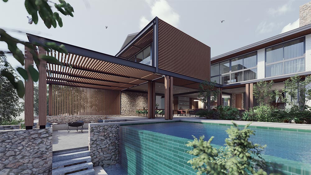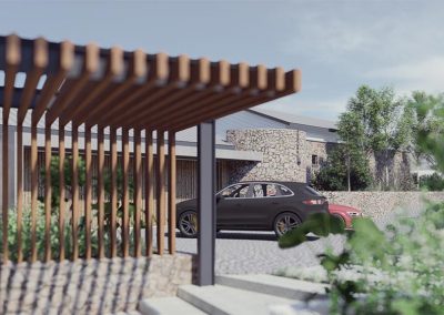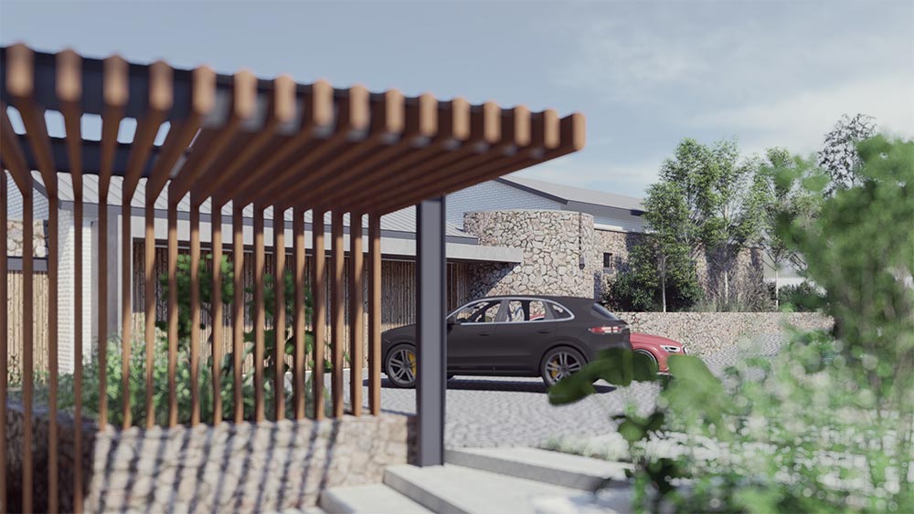 This rustic modern home design showcases a captivating facade defined by a harmonious interplay of contrasting textures. The warm, natural allure of Lunawood merges seamlessly with the rugged charm of rock cladding, while painted face brick adds a touch of timeless elegance. To accentuate the contemporary aesthetic, sleek black steel elements are thoughtfully integrated. This design harmoniously blends rustic elements with modern sophistication, creating a home that’s both inviting and visually striking.