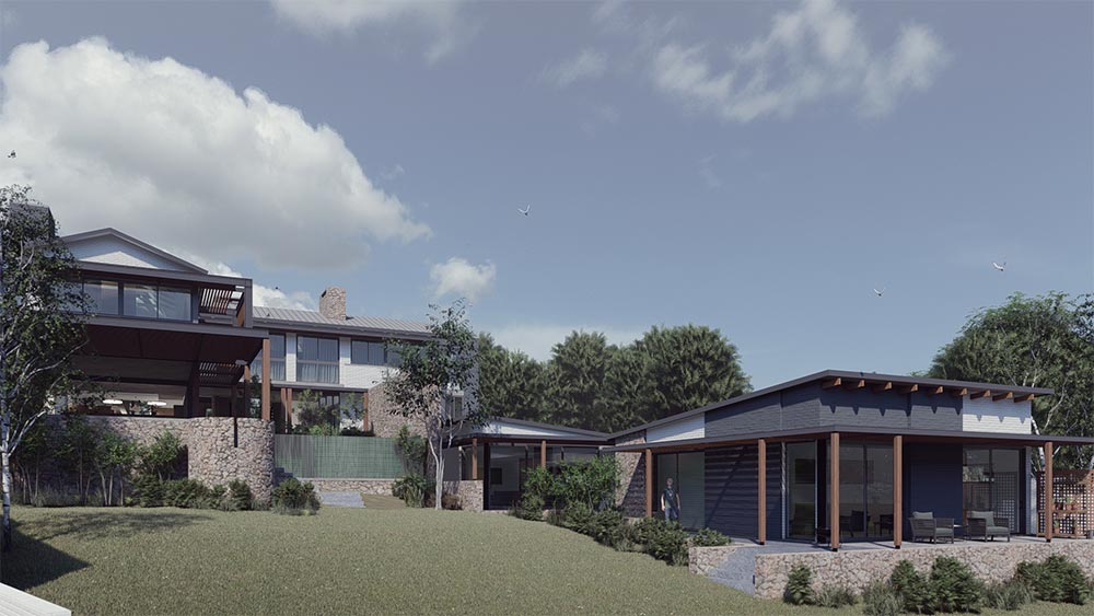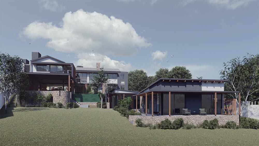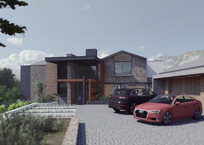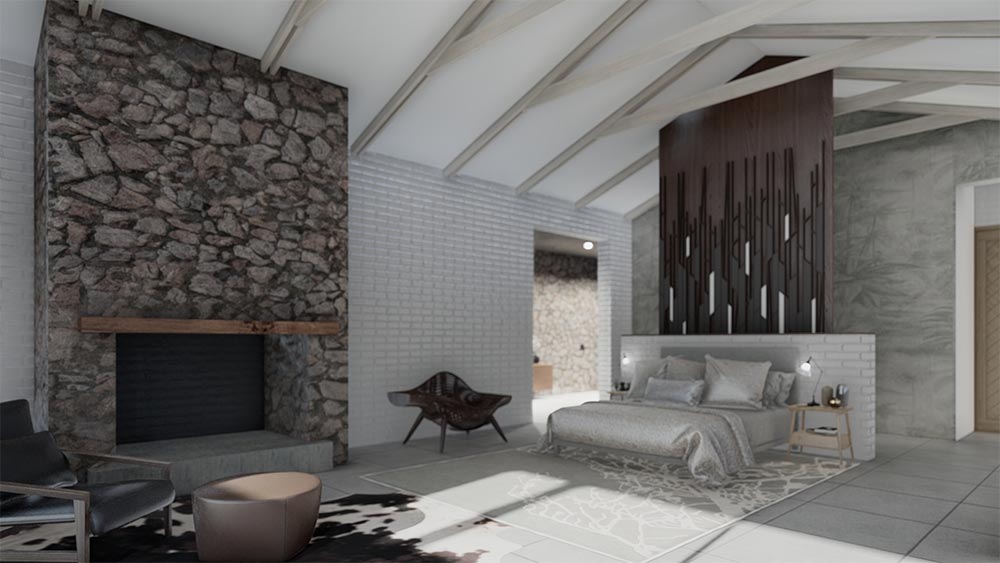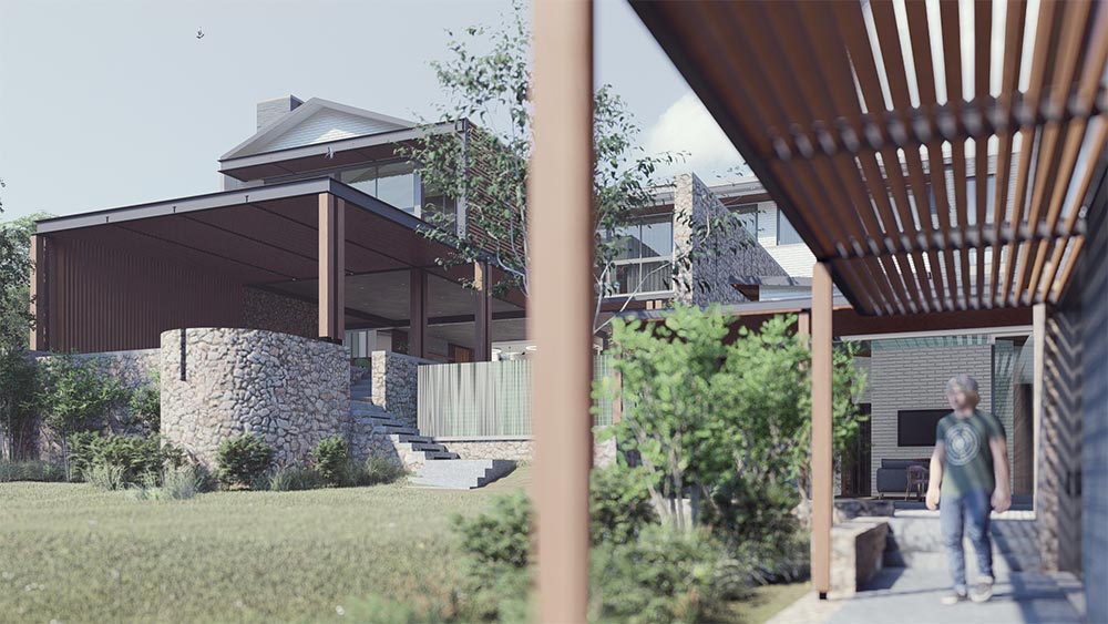Our concept design for this rustic modern home combines natural elements with contemporary aesthetics. The facade boasts the timeless appeal of painted face brick with striking steel accents, while the juxtaposition of Lunawood accents and rugged rock walls adds texture and character.